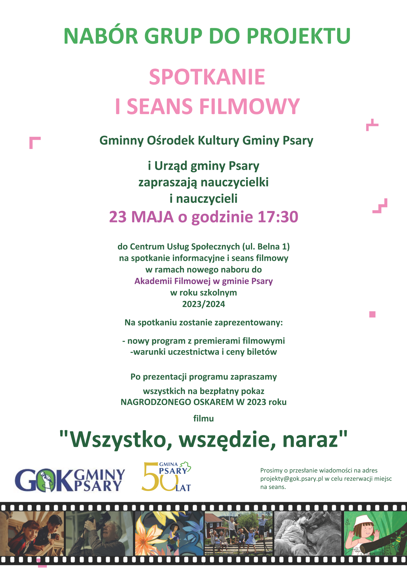 Zapraszamy wszystkich zainteresowanych udziałem w roku szkolnym 2023/2024 w “Akademii Filmowej w gminie Psary” na spotkanie informacyjne.